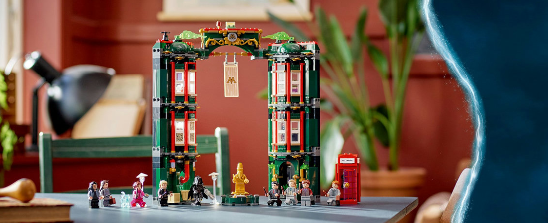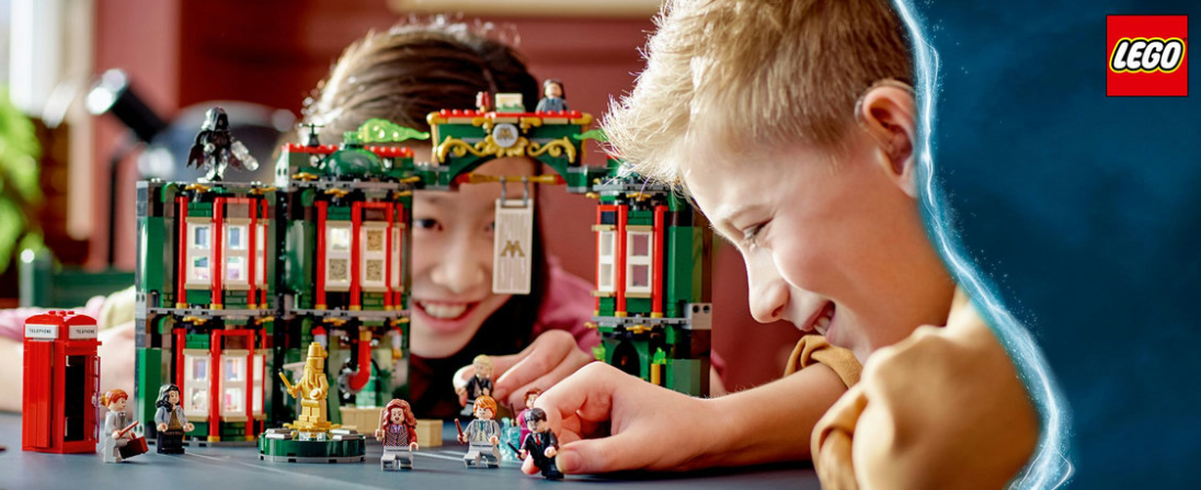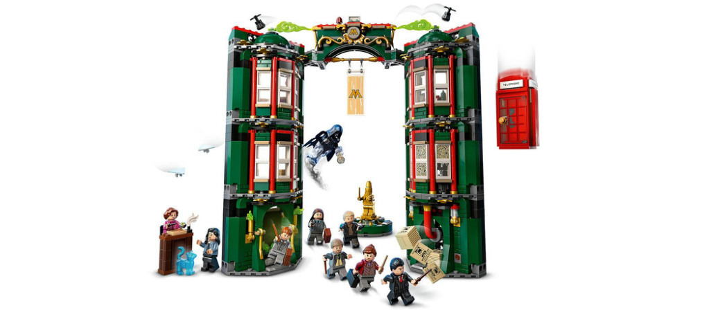 Este conjunto de vários andares captura toda a escala e escopo das atividades do Ministério da Magia. Personagens familiares incluem Harry Potter, Hermione Granger™ e Ron Weasley™ que – com um giro de cabeça e uma nova peruca – se transformam magicamente em Albert Runcorn, Mafalda Hopkirk e Reg Cattermole. Atrás da fachada há vários interiores detalhados para explorar: o escritório de Dolores Umbridge, o escritório de Arthur Weasley, o Salão da Profecia e a Sala do Tribunal. As crianças devem encontrar o medalhão da Sonserina™ e escapar sem serem pegas por Yaxley, Pio e o Dementador™! O aplicativo gratuito LEGO Building Instructions permite que as crianças ampliem e girem enquanto constroem, e o design modular facilita a reconfiguração do Ministério para novas aventuras sem fim.