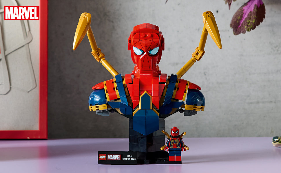 O modelo para construir e expor inclui cabeça giratória, braços totalmente articulados e uma minifigura LEGO do Homem-Aranha de Ferro.