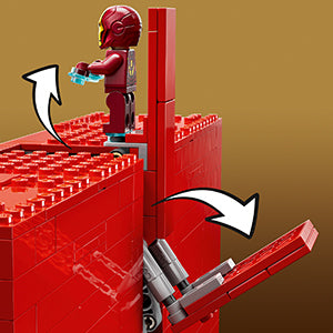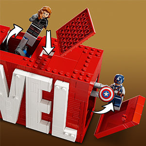 Aperte os 3 botões no topo do modelo da MARVEL para fazer as 5 minifiguras pularem para fora do logo.