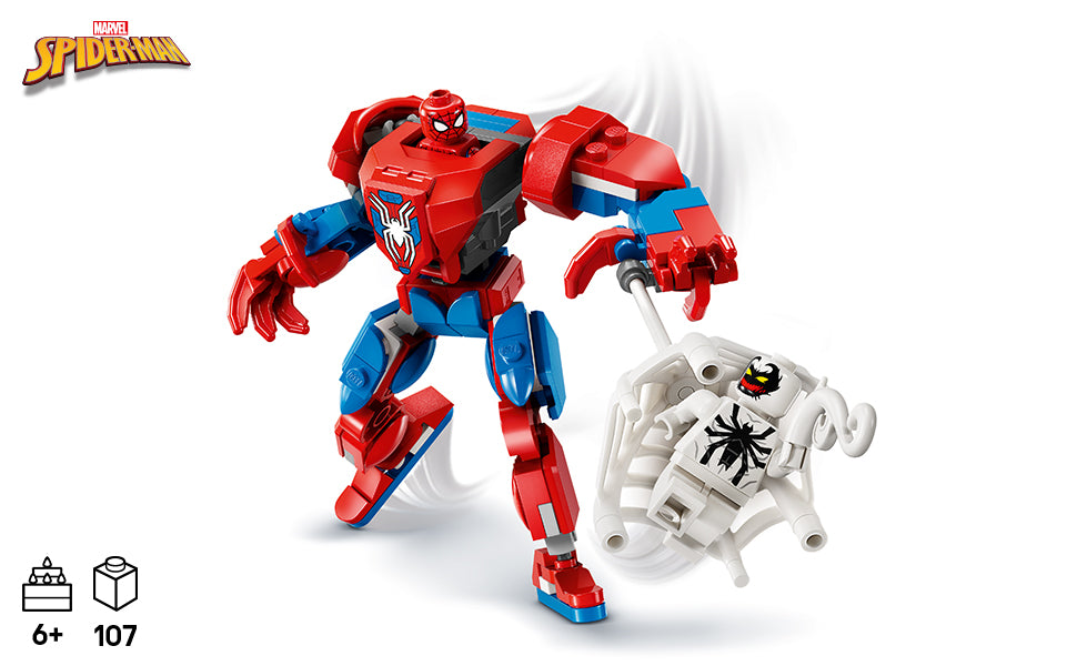 O robô tem braços, pernas e dedos móveis. Seu torso se abre e revela um cockpit que pode alojar a minifigura do Homem-Aranha.