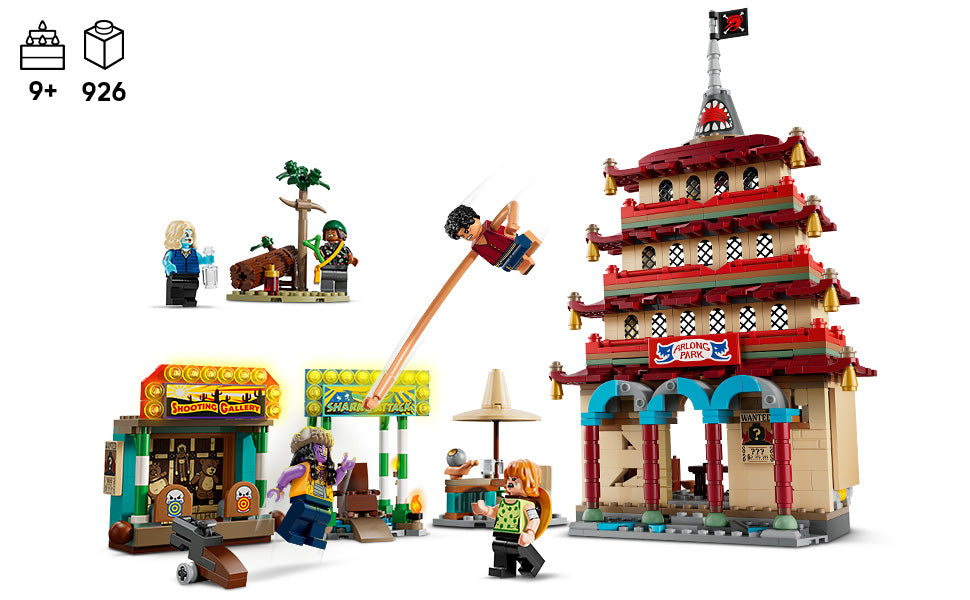 As crianças podem explodir o telhado do pagode, treinar a mira na galeria de tiro e colocar o vilão no edifício de ataque de tubarão.