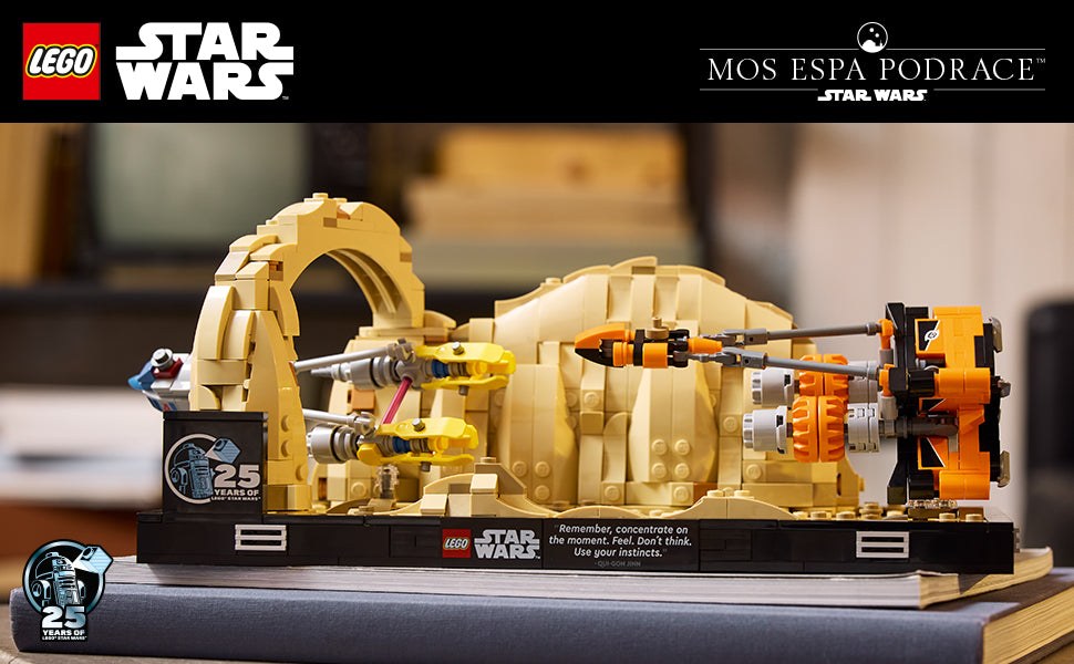 Este diorama detalhado construído com peças propõe o registro de um momento da Corrida de Pods de Mos Espa em Tatooine.